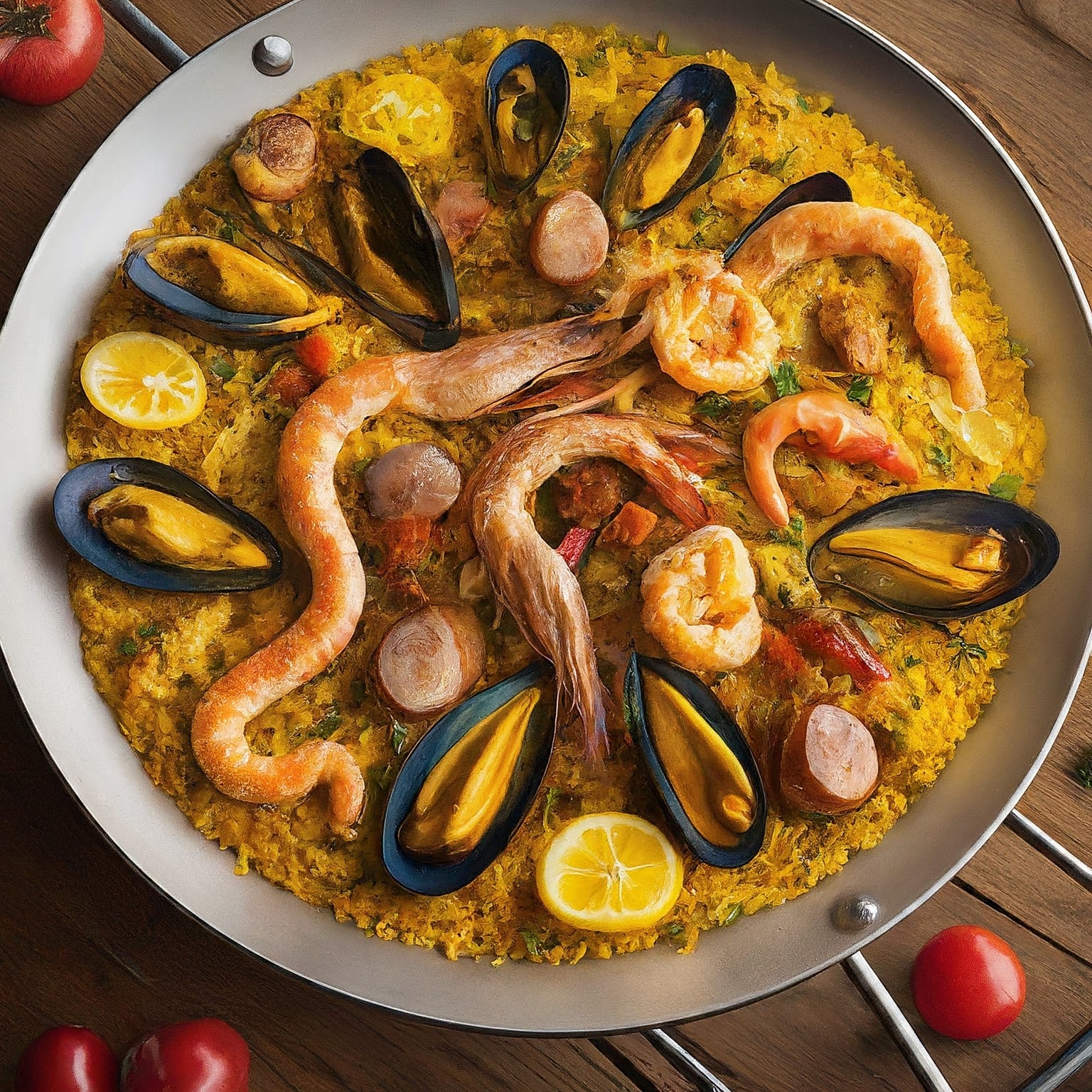Un festín de mariscos y carnes sobre arroz con auténtico sabor mediterráneo.
